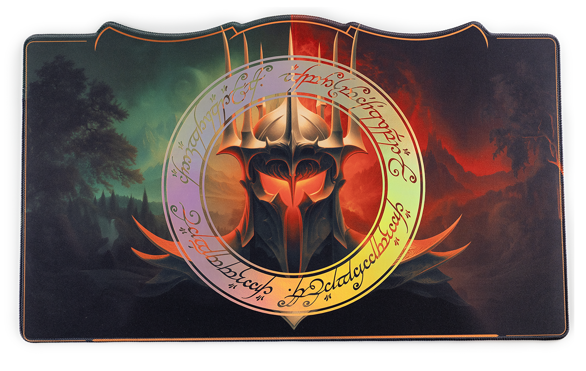 Channel the presence of the Dark Lord with this Legendary Crown Playmat. A striking portrait dominates the design, backed by a sweeping fantasy landscape, while a radiant foiled ring shines at the center. Crafted from smooth neoprene with stitched edges and a custom silhouette, it blends artistry with durability for card players who want a mat as commanding as their deck.